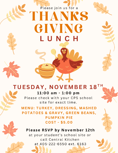 Please be sure to RSVP by Wednesday, November 12th at your student's school or through the Central Kitchen at 405-222-6550 ext. 6163. We can’t wait to celebrate this special season of gratitude together!